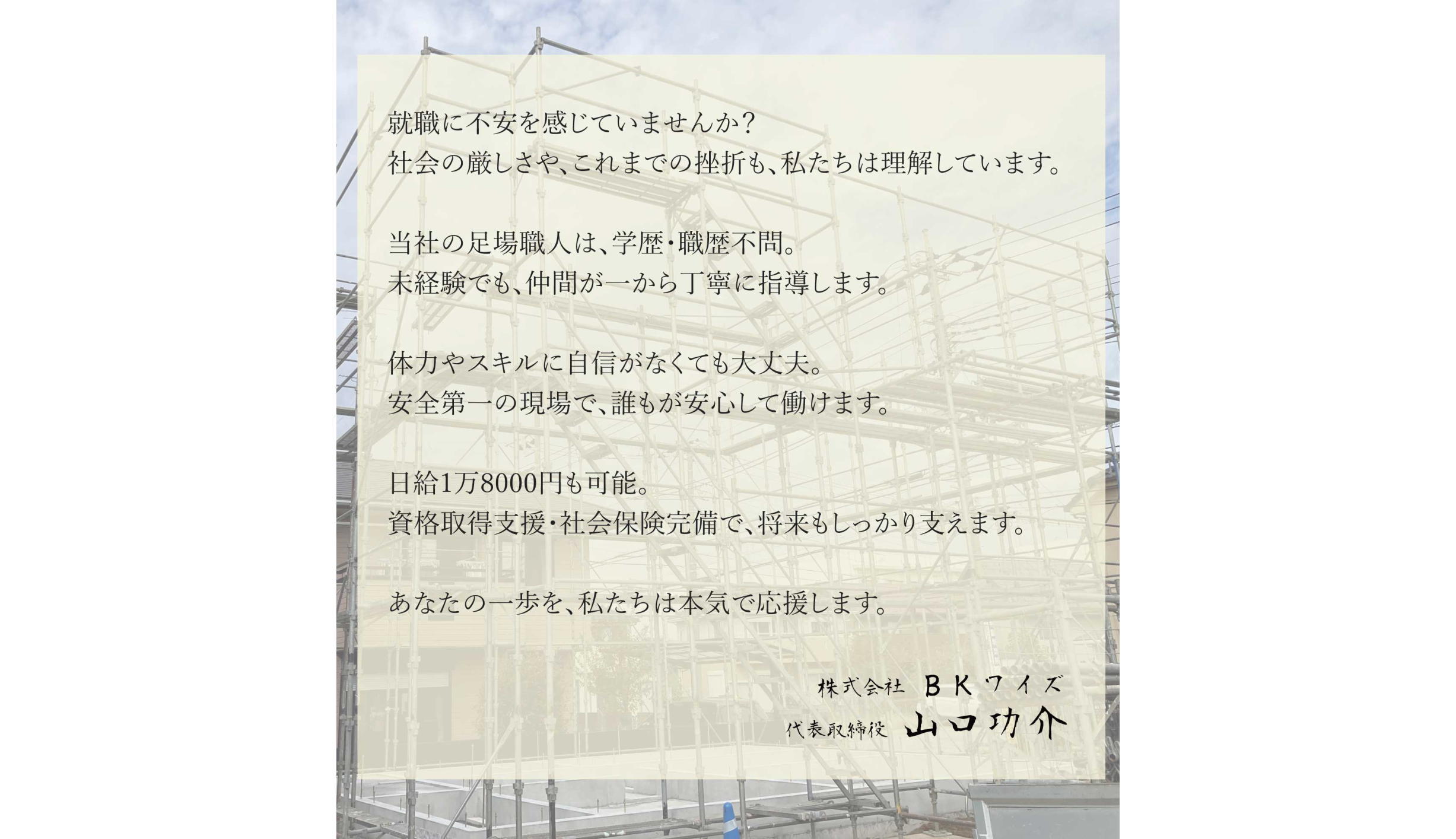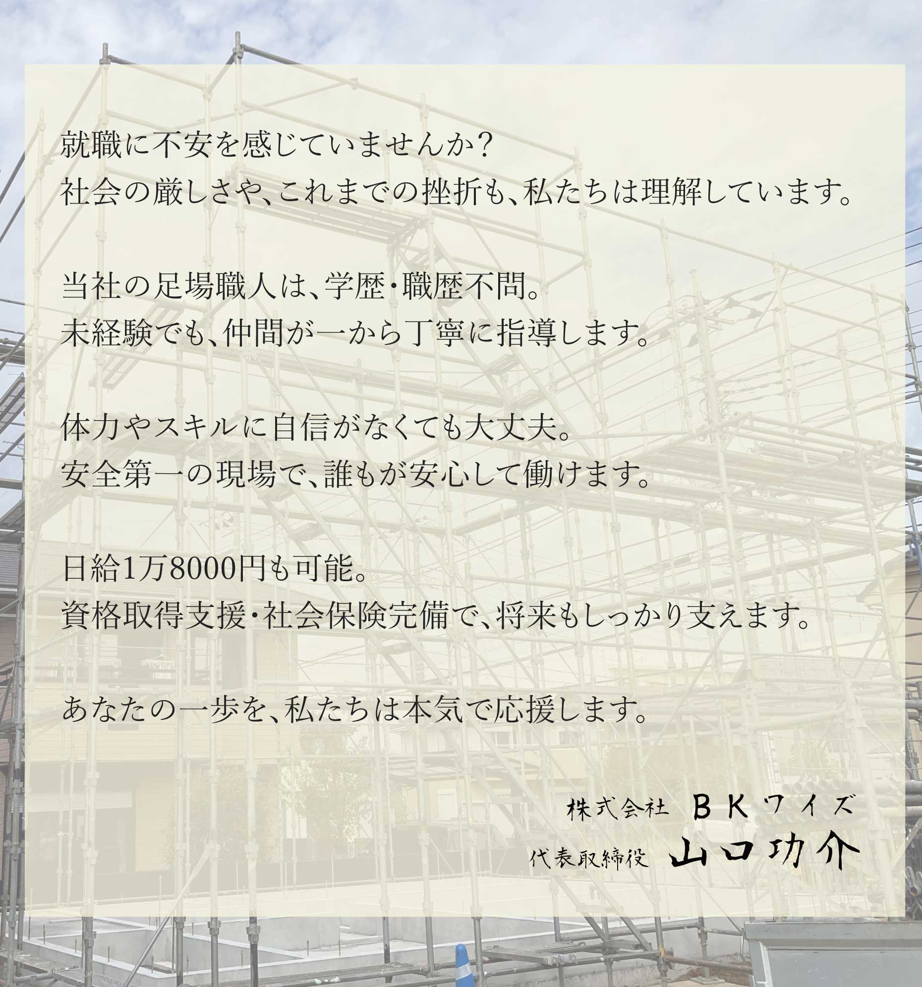 高校卒業後、ゼロからBKワイズに飛び込んだ!3ヶ月で足場の組み方を覚え、3年で一人前の職人に。