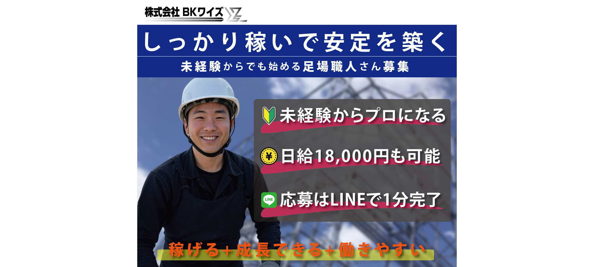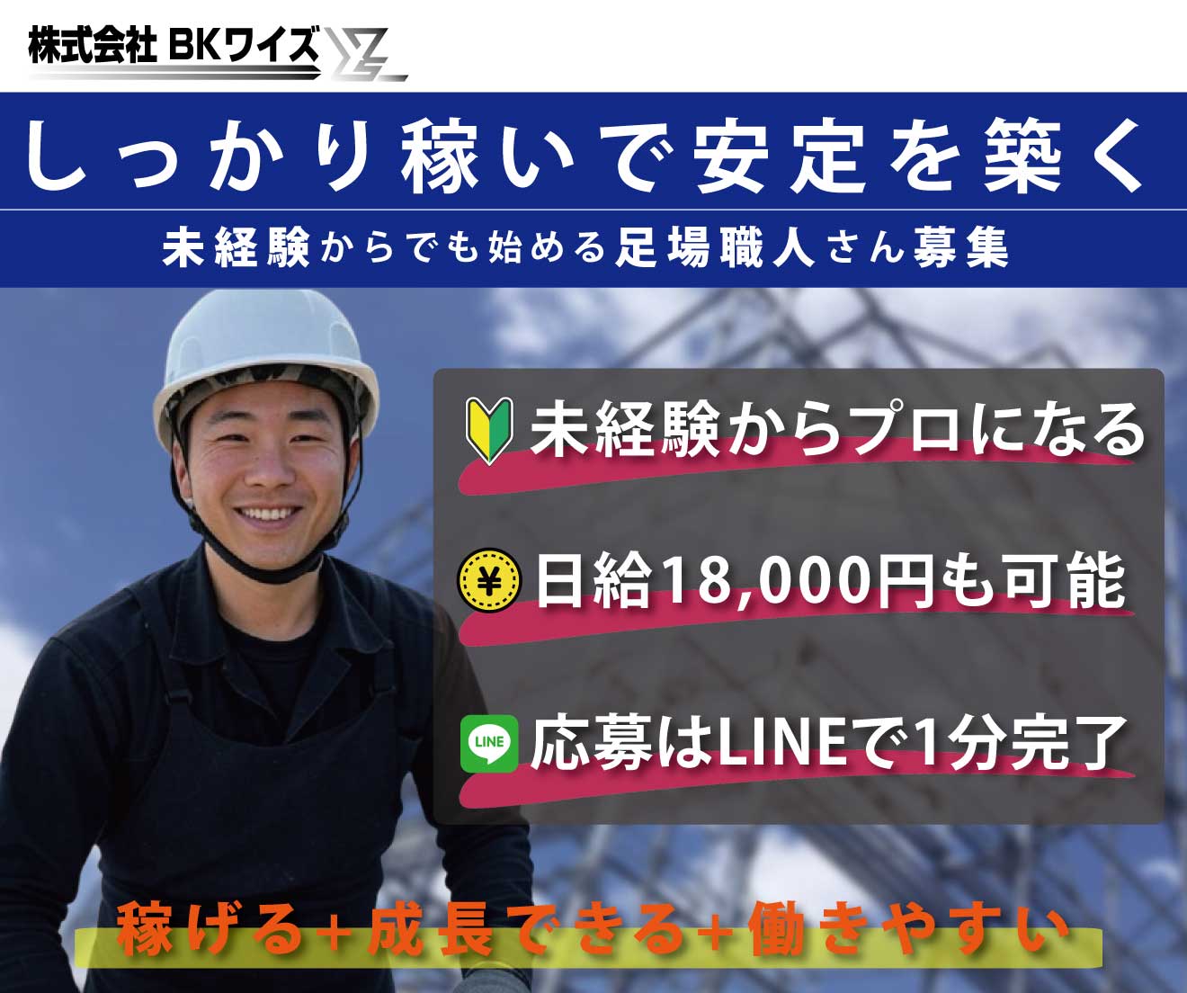 八千代市生まれで、地元で働きたくてBKワイズへ。未経験から2年で足場のプロに!完成した建物を見るたび、めっちゃ達成感!仲間と協力して仕事する毎日が楽しい。安定して稼げるし、LINEで応募して良かった!次は資格取得を目指してます!