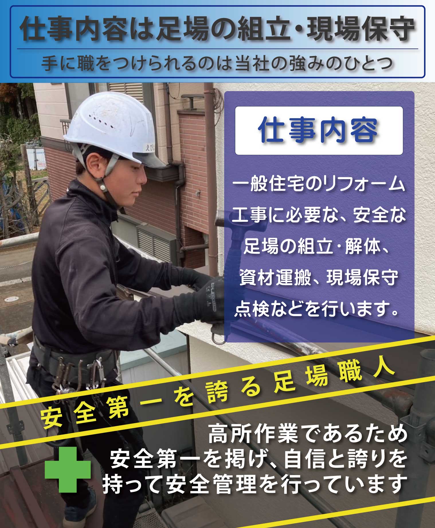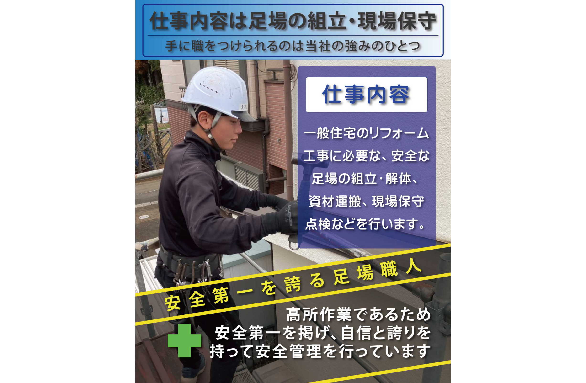 ・一般住宅のリフォーム工事をメインに安全に工事を進める為の足場の組立/解体作業を行うサービススタッフ